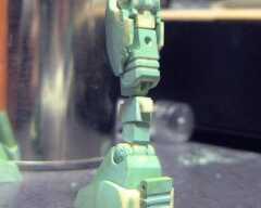 そこから引き出るんかい!ちゅう方式だが、他に案がない。 サイズ的に引き出しがぎりぎりで強度が微妙でかつ、腕を上げられるのがここまでである。 肘のなんちゃってボールジョイントが貧弱で、肘が伸びない。 手首関節もつけたい。 キリがない。
