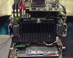 筐体開放状態、中ファンありでヒートシンクプレートがたぶん50℃オーバーになってるもよう。